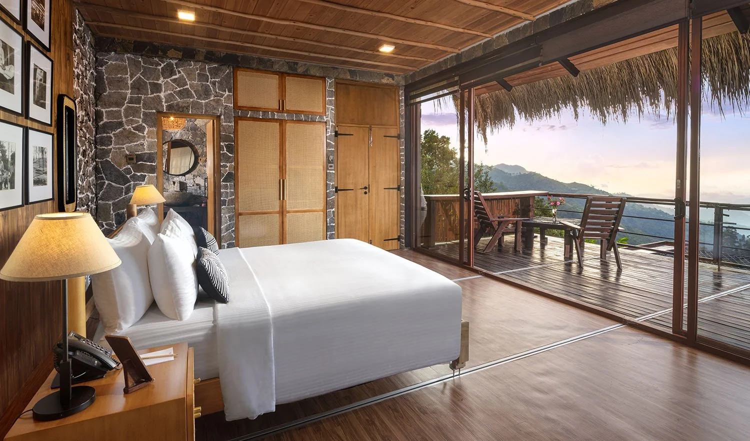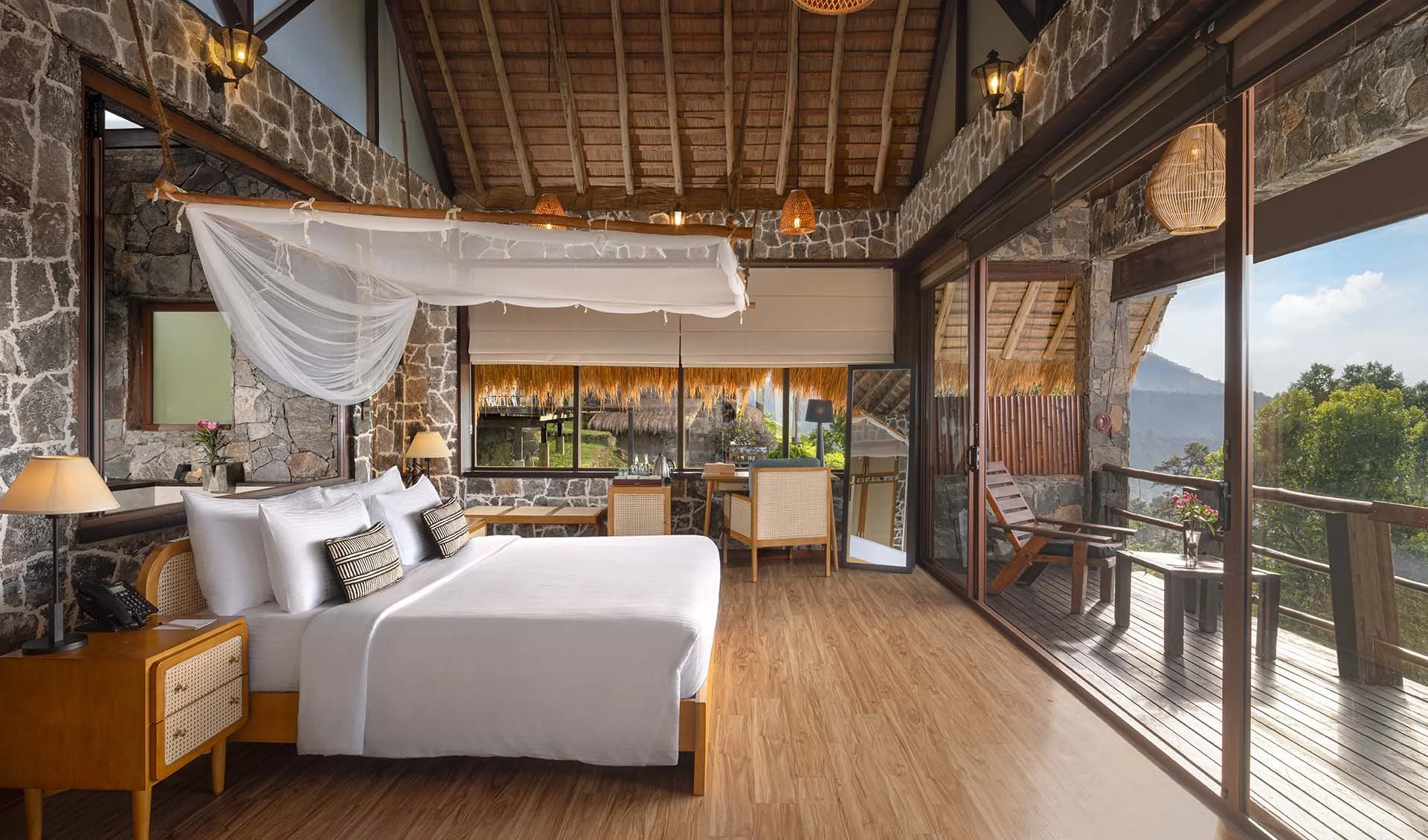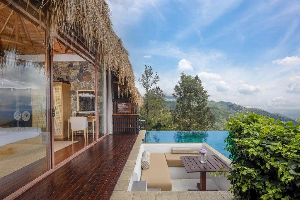 THE LOOK: Reclaimed timber chalets, alang-alang thatched roofs, stone paths, panoramic decks.