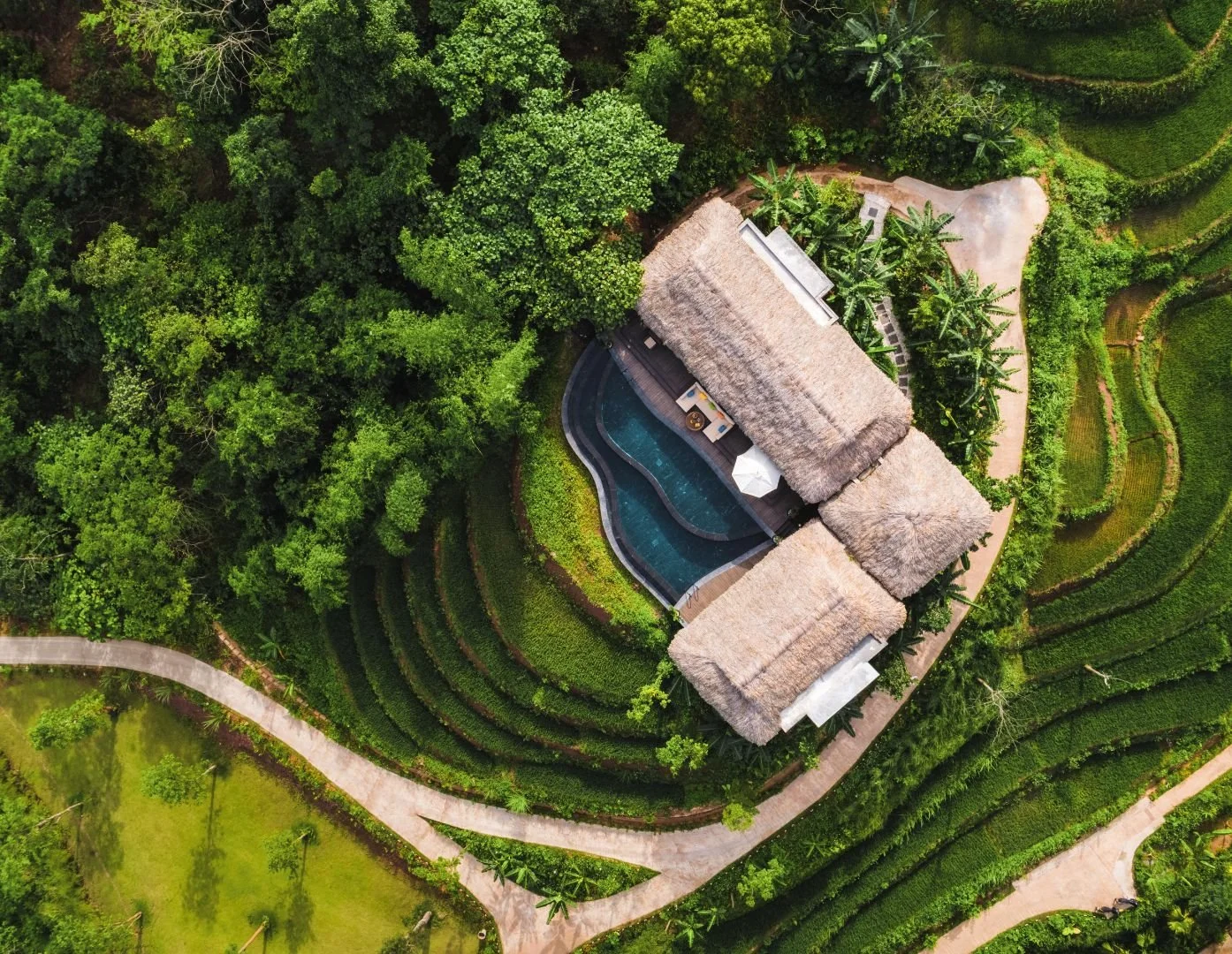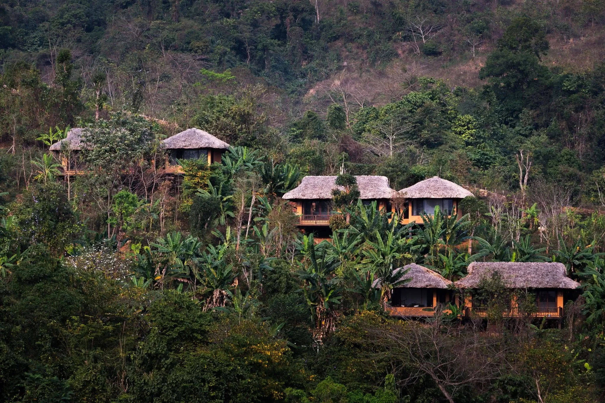 ARCHITECTURE: Built from earth, stone, bamboo, and thatch — no steel frames, no concrete slabs. Villas are positioned to protect the forest and blend into the slope.