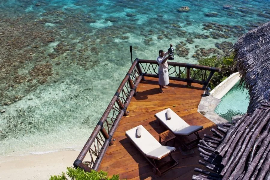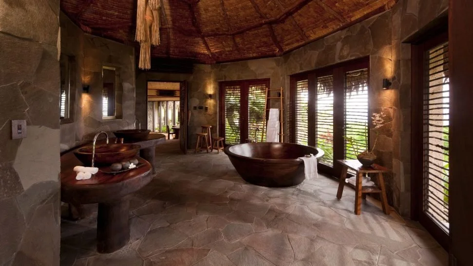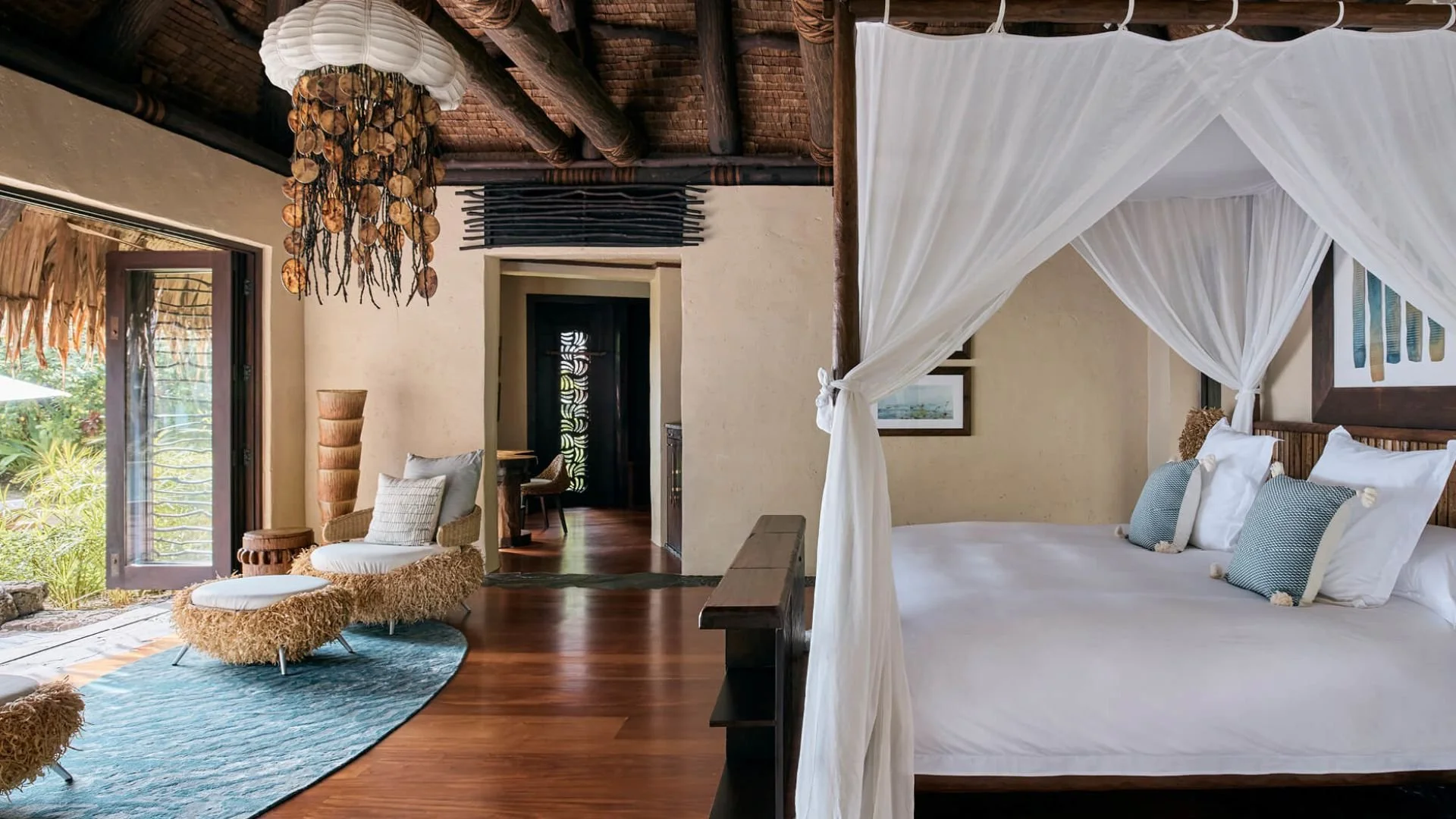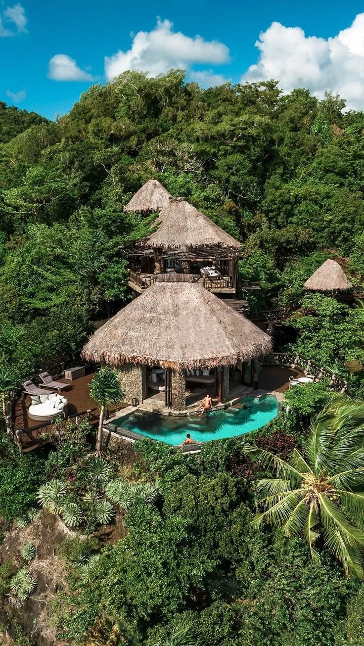 The villas, just 25 of them, feel born of the island. Woven into cliffs, hovering over beaches, or hidden in the jungle, they’re built from volcanic stone, native timber, and thatch, all curved to echo the land’s natural rhythm. Inside: hand-carved beds, oversized sunken tubs, and plunge pools that spill into rainforest. You don’t just arrive here. You disappear and then you find yourself again.