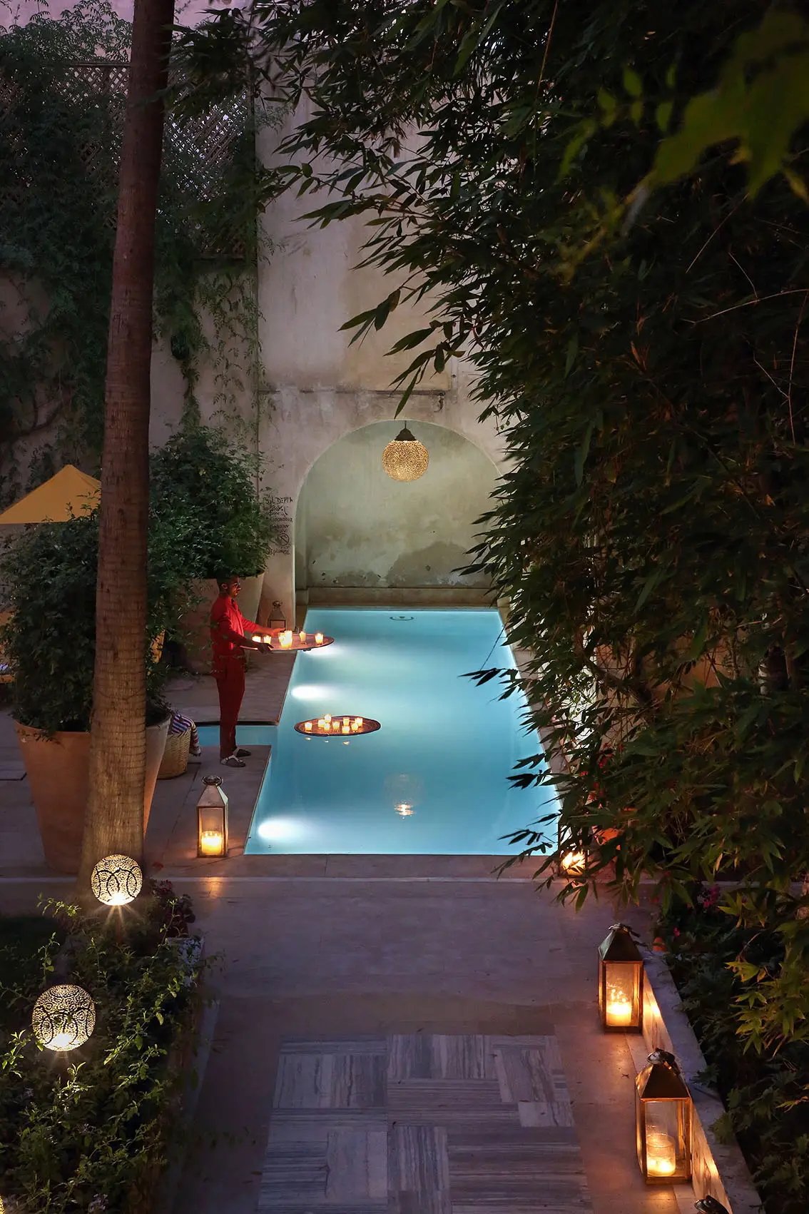 Evenings unfold with intention. Candlelight flickers across painted ceilings. The scent of jasmine and oud wafts through the courtyards. Live music drifts between columns, sometimes jazz, sometimes gnawa, always unexpected. Conversations unravel over slow tagines and handmade ceramics, and the medina murmurs beyond like a distant lullaby.
