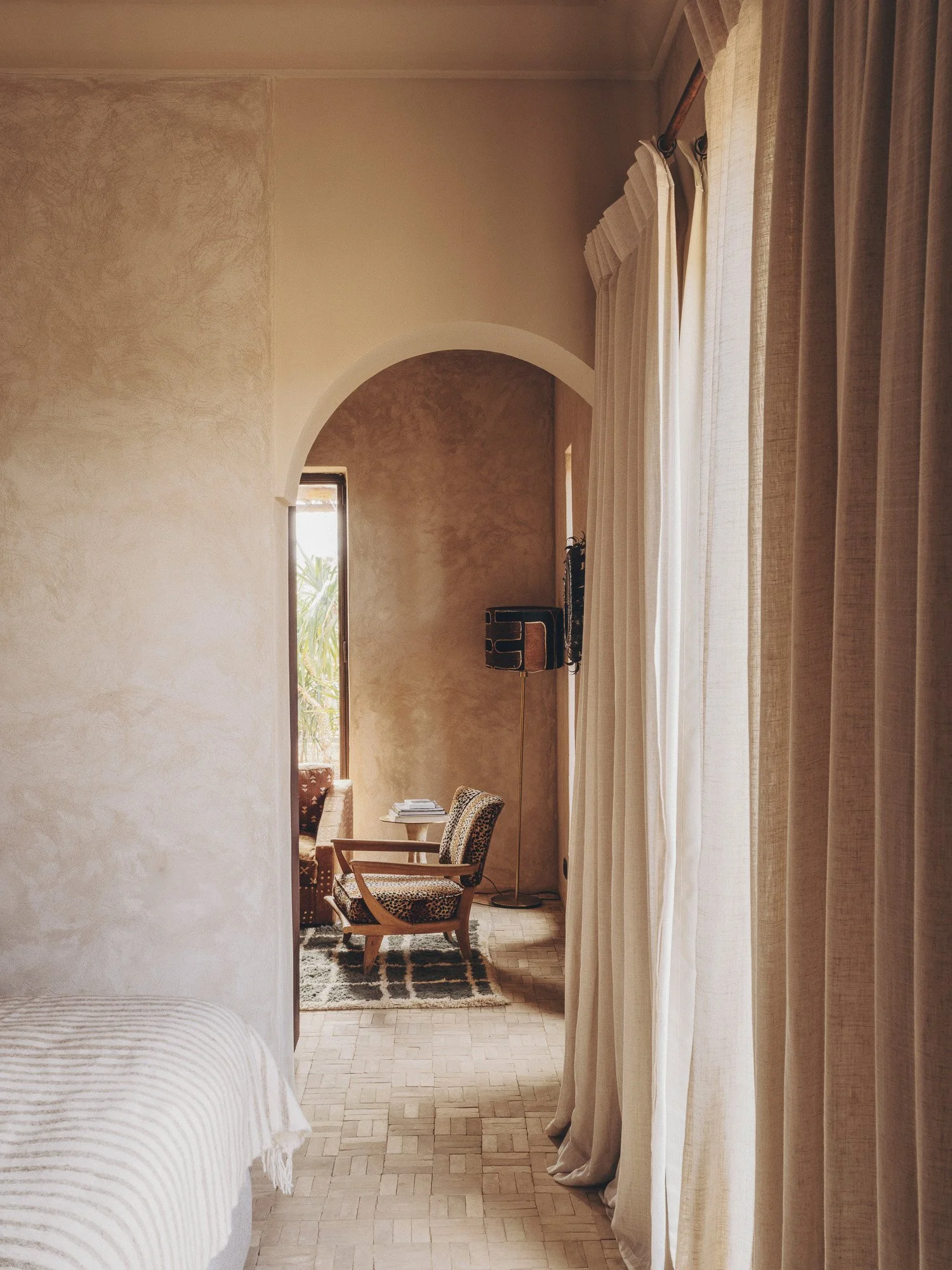 Suites are earthen sanctuaries. Tadelakt walls in desert rose, carved wooden doors, stone tubs, and windows that frame silence. Linen drapes move with the mountain breeze. Hammocks wait in almond groves. This is barefoot elegance wrapped in North African warmth.