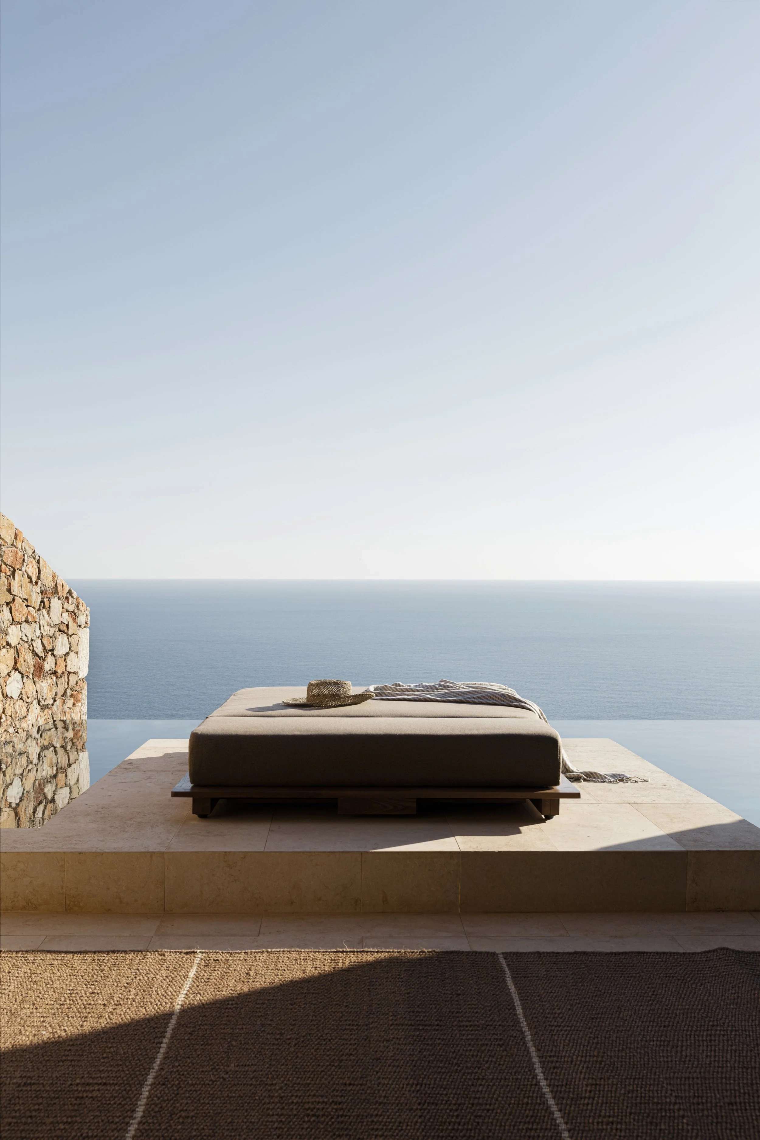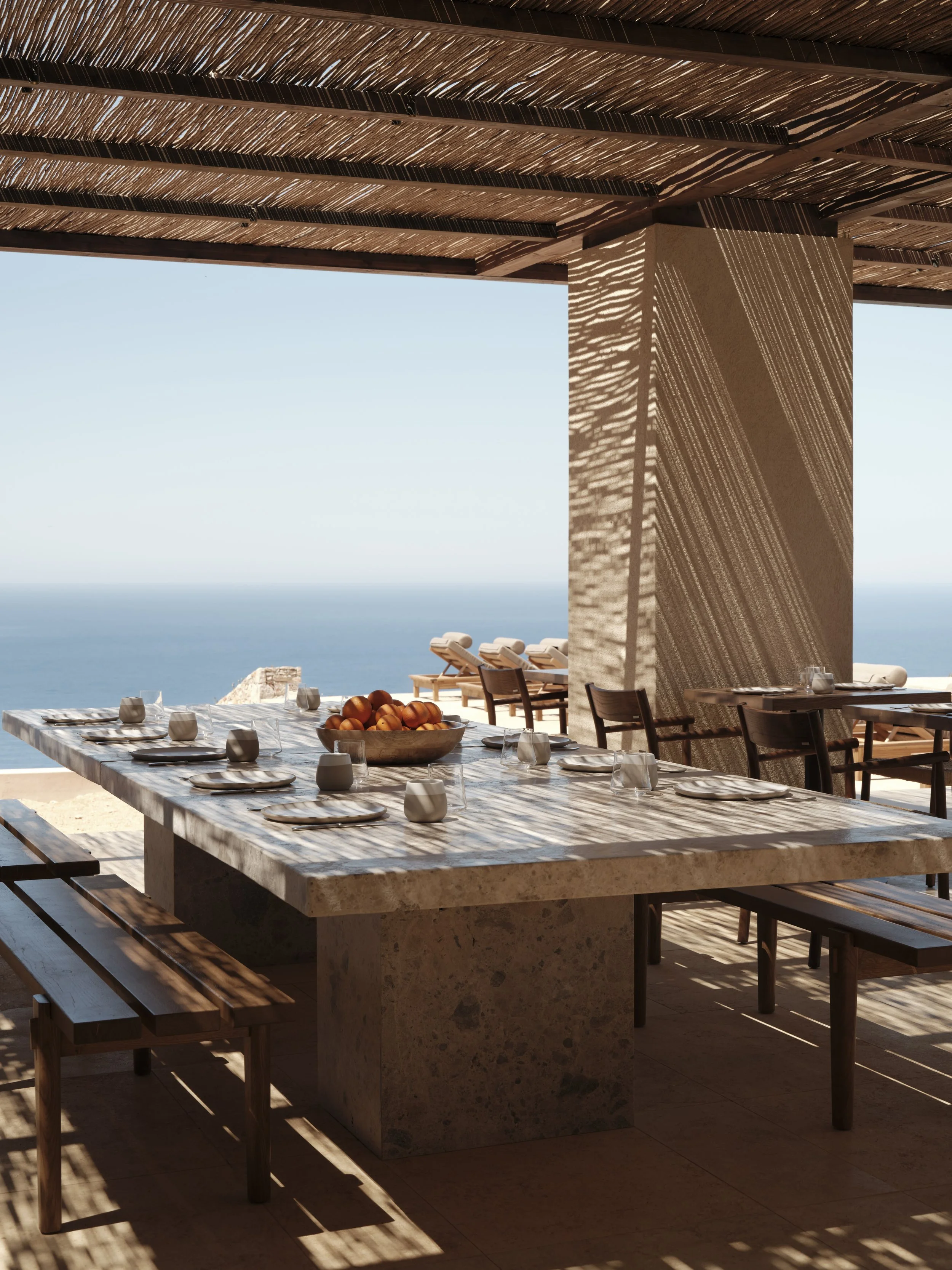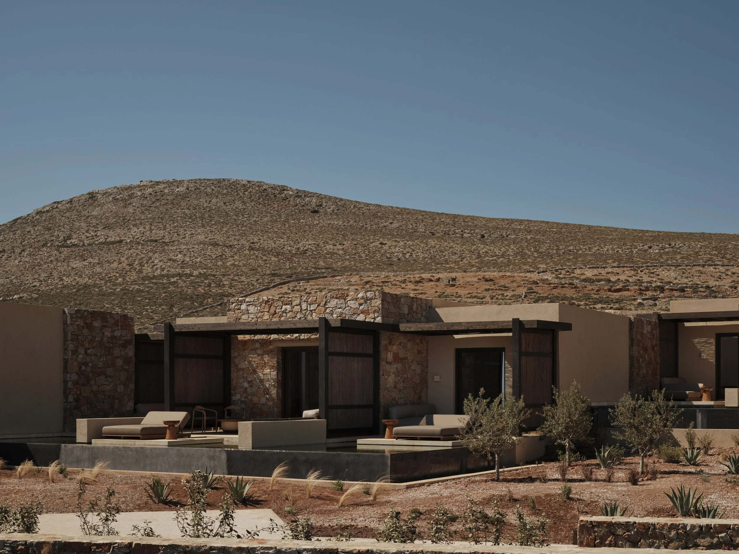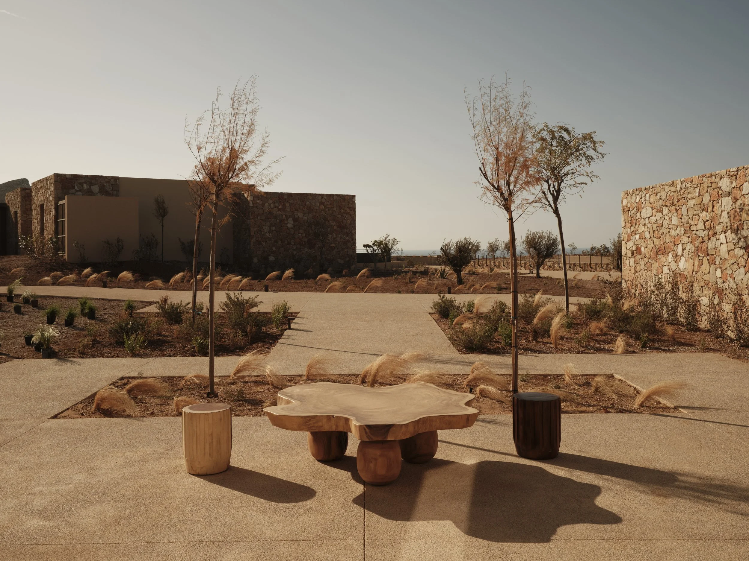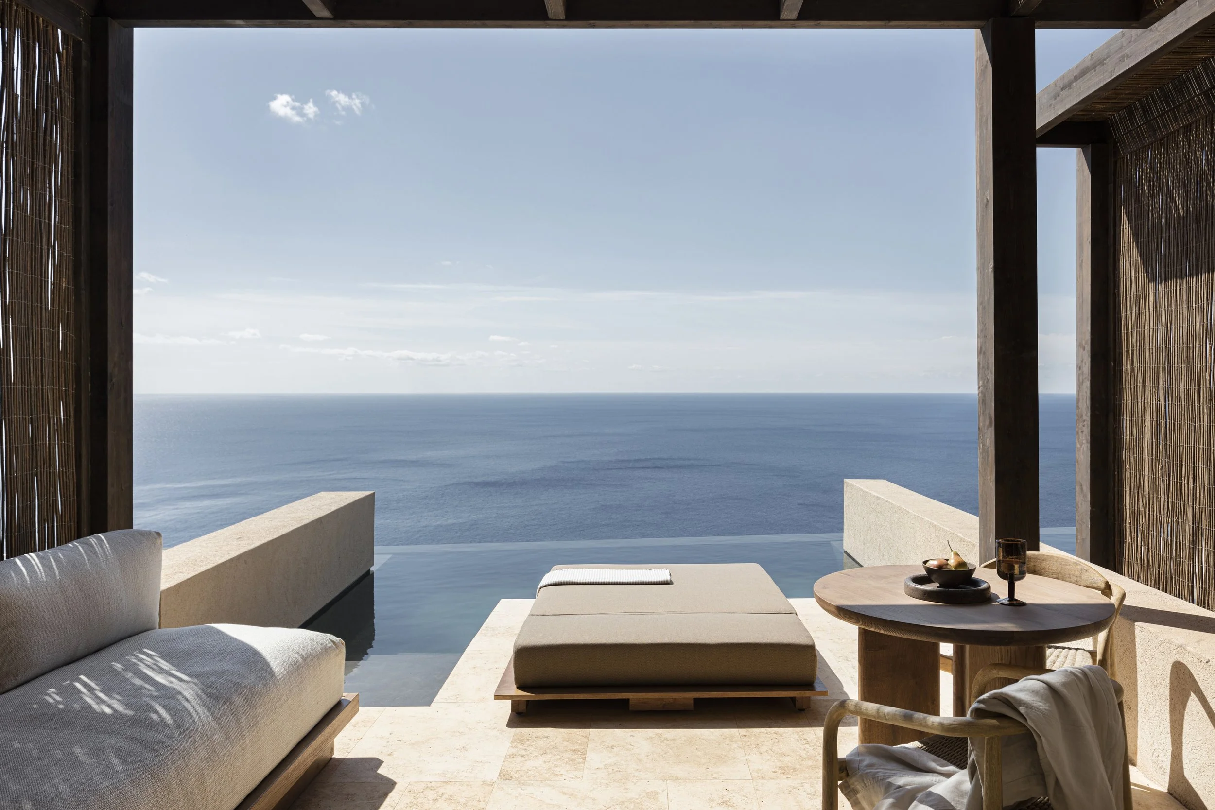 THE LOOK: Bleached stone, linen-draped lounges, hand-poured concrete, sun-charred wood, volcanic textures.