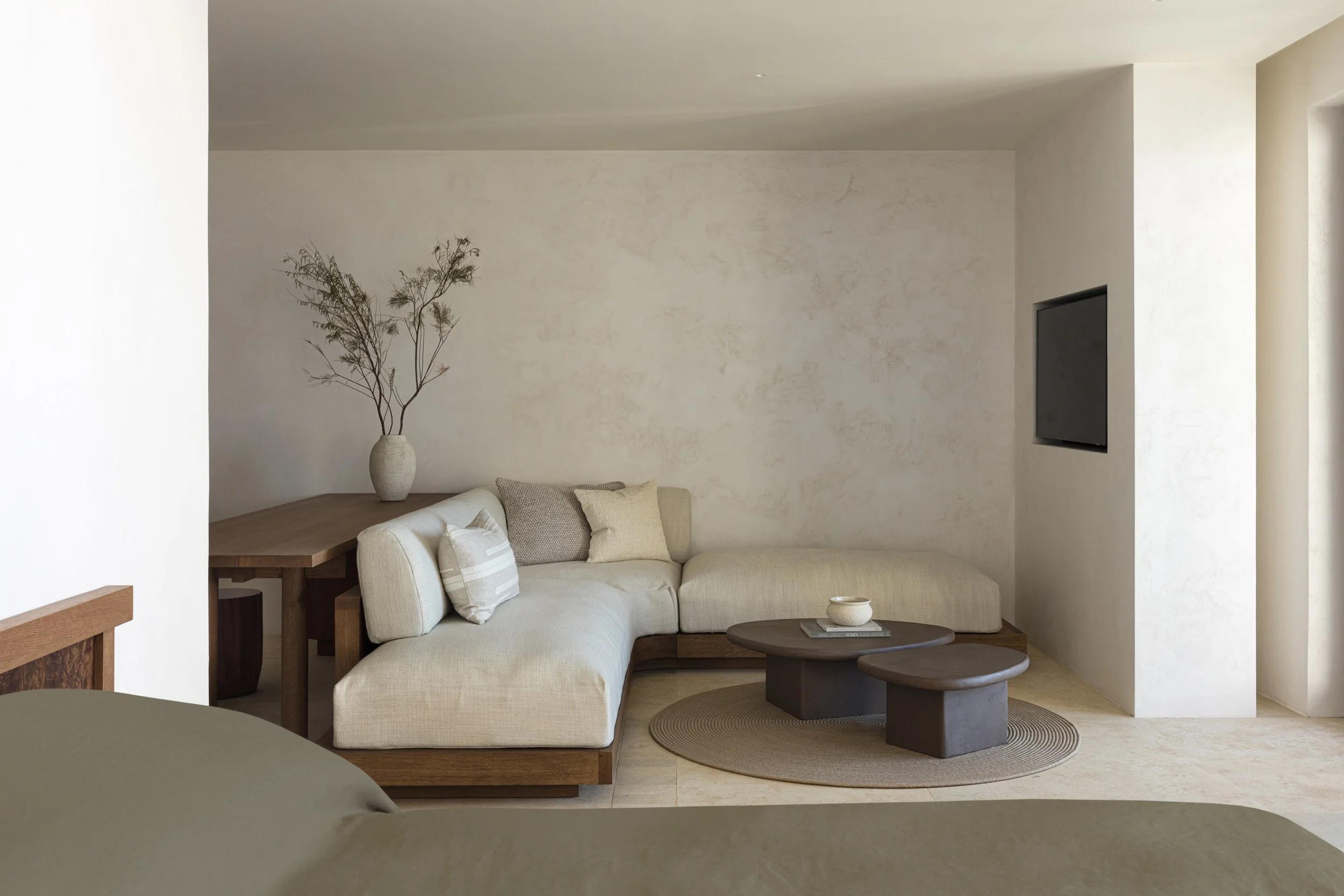 No mini bars. No tech clutter. Just texture, temperature, and tonality.