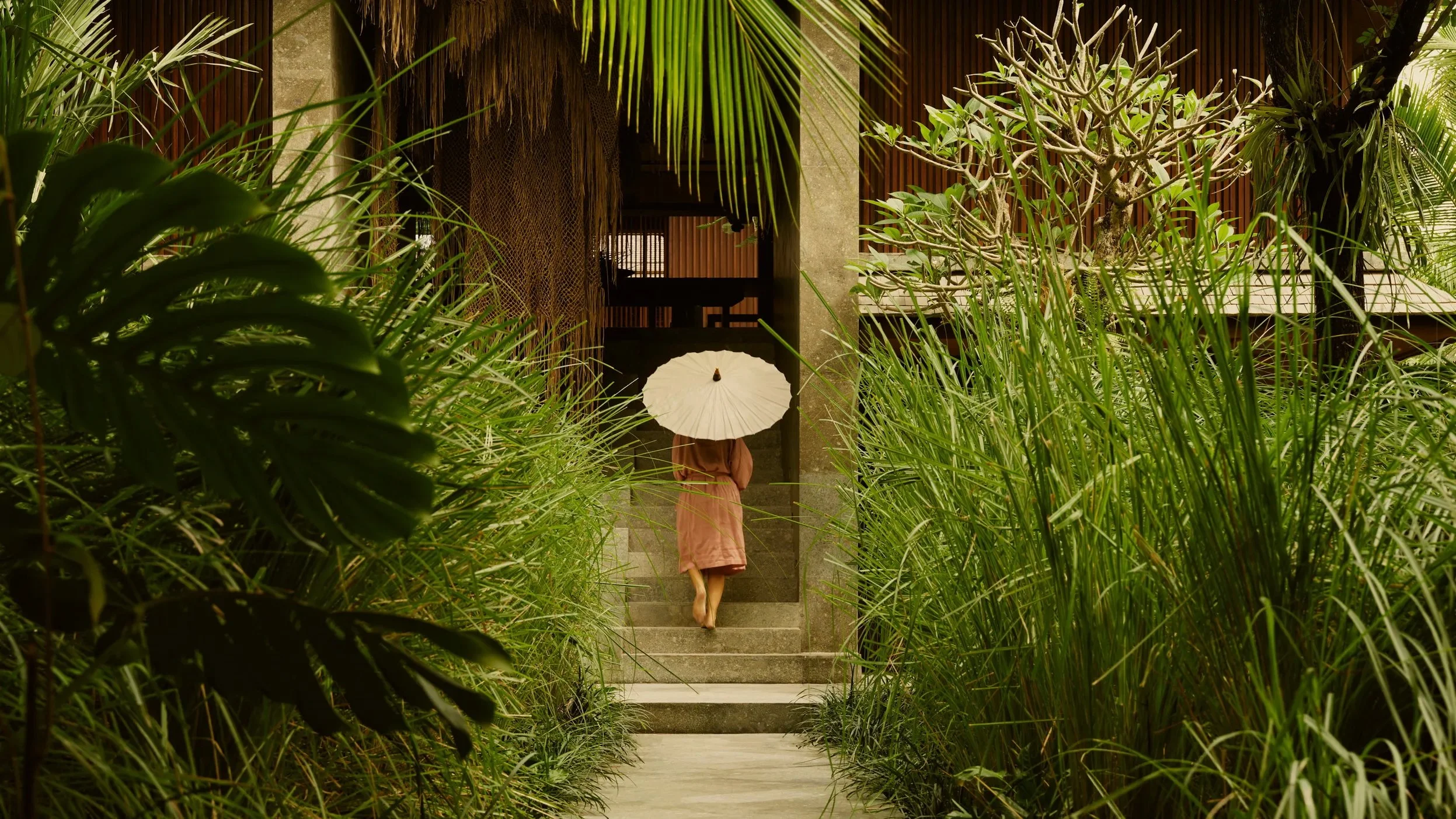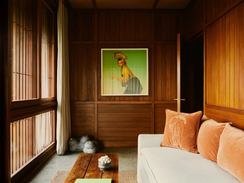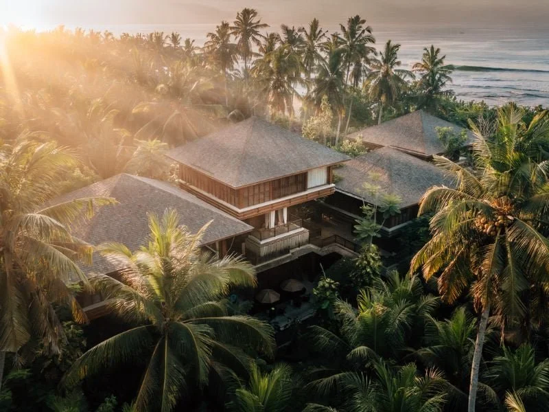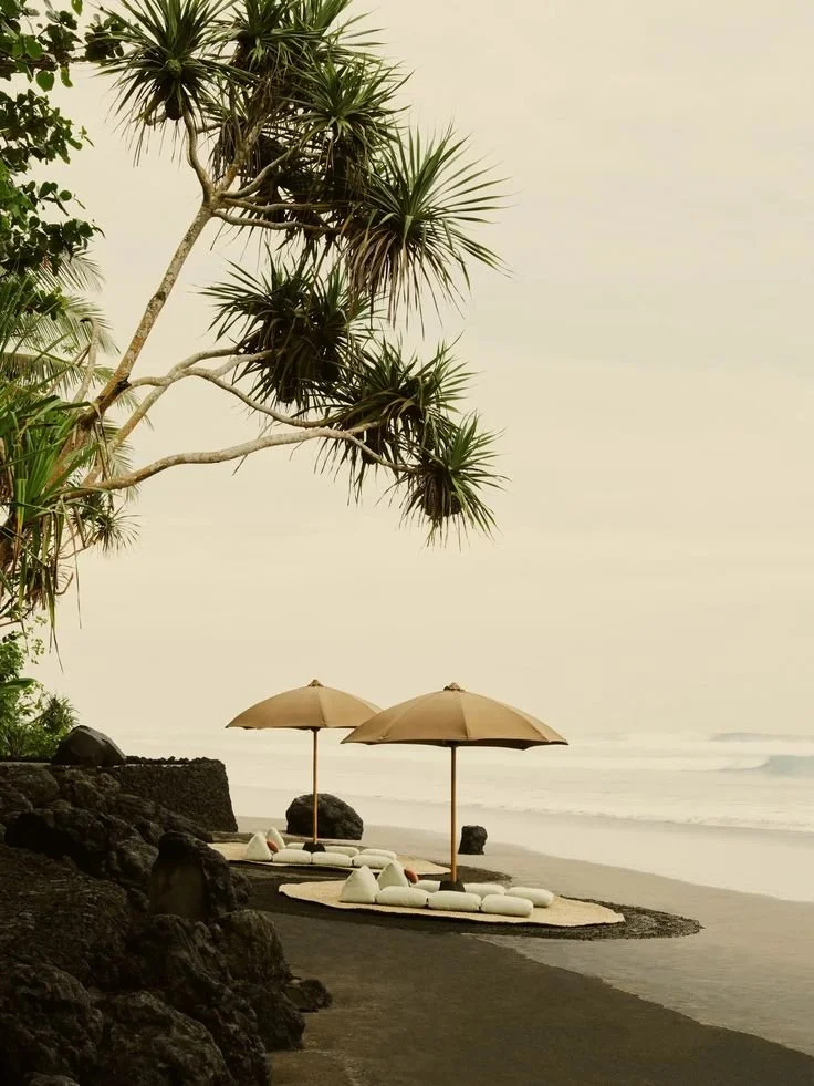 EDITORIAL VIBE: If Wes Anderson had a surf altar. Brutalist towers rise through coconut trees, with interiors that blend Bauhaus, Balinese craft, and slow sensualism. You arrive by secret path and are greeted by incense and tide.