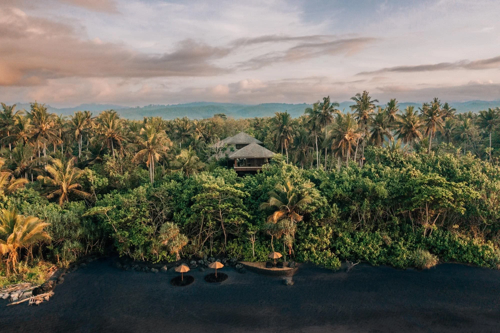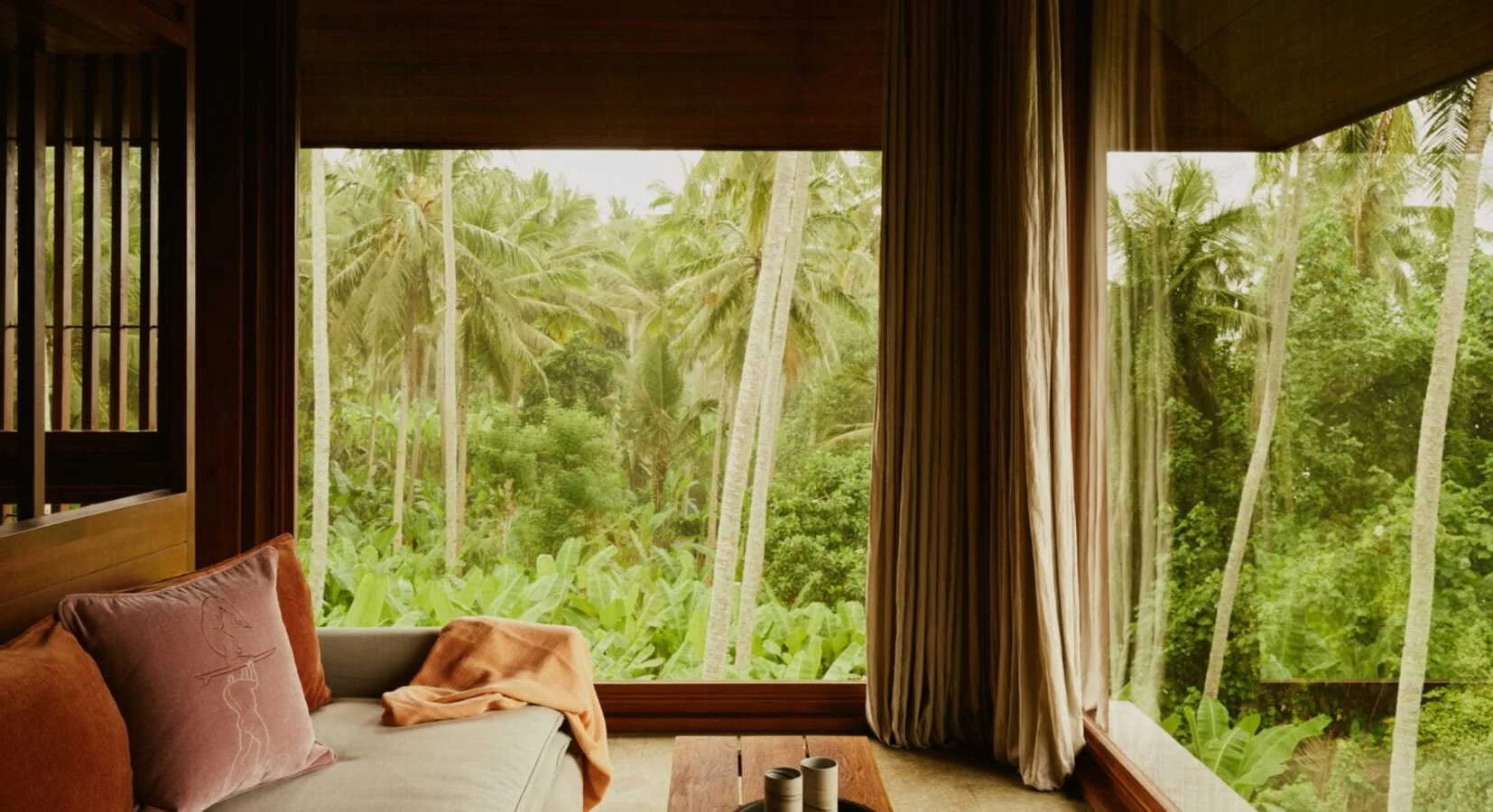 Interior elements are handmade - teak furniture, ceramic vessels, handwoven throws. Outside: nothing but palms and Pacific horizon.
