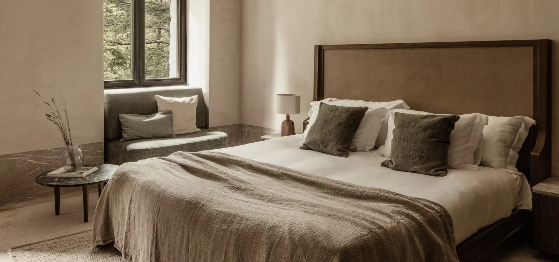 Rooms are monastic in silhouette, cinematic in detail. Expect vaulted ceilings, brushed bronze fixtures, moody palettes, and bathtubs you’ll never want to leave. No room looks the same -each one feels like a secret.