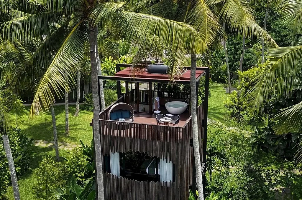 THE LOOK: Volcanic stone, recycled teak, thatch-roofed treehouses and modernist villas with river views. Private plunge pools and open-air bathrooms abound.