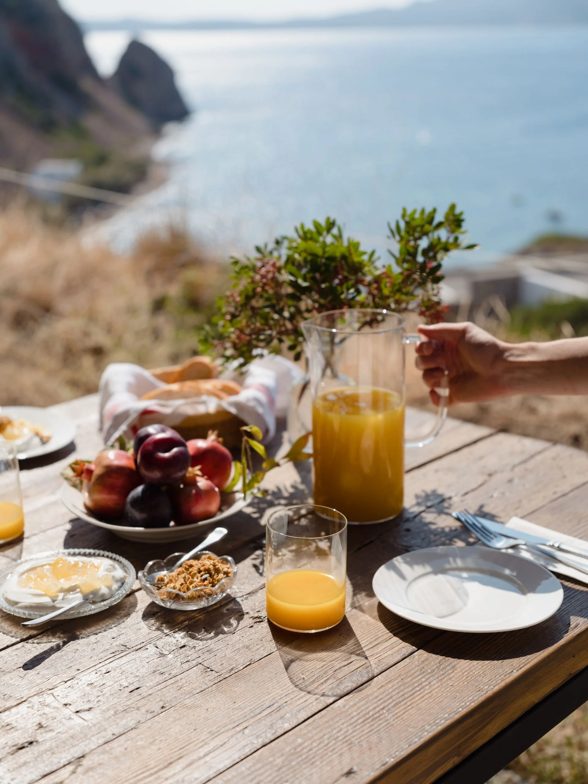 Wake with the sun, swim before coffee, journal with your feet in the thyme. Skinopi days flow like saltwater - no resistance.