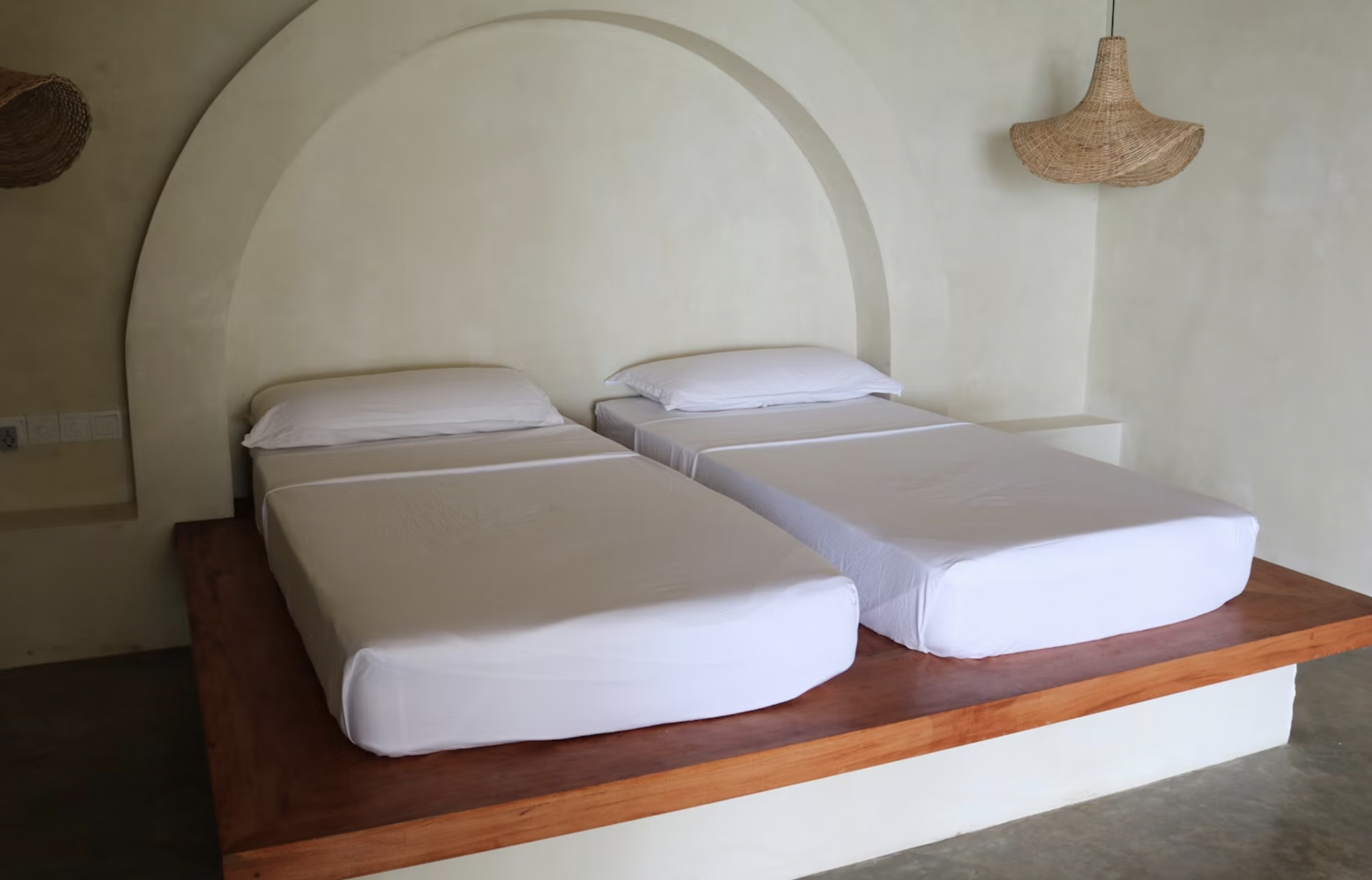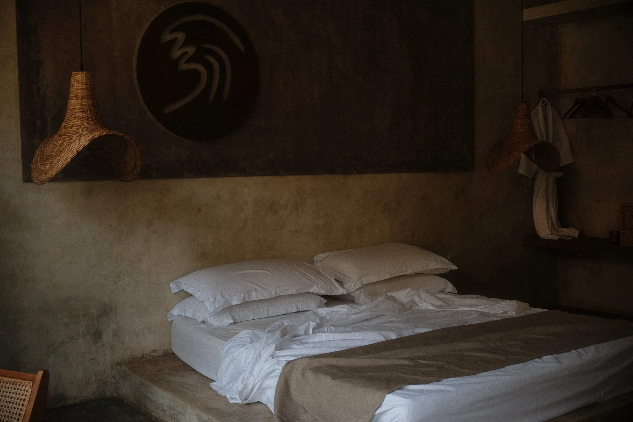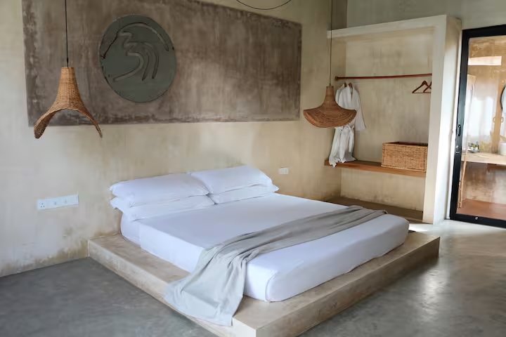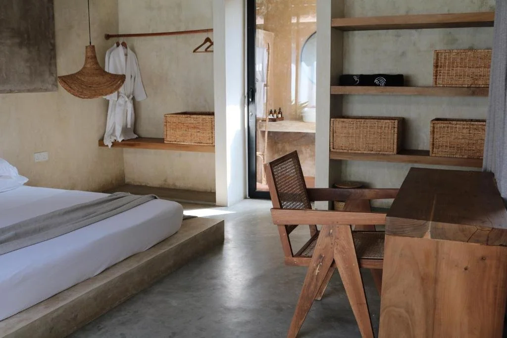 Design here is dialled-down and dusted in sea air. Hand-poured concrete, linen curtains that flutter with the tide, and soft pendant lighting that makes even a mosquito net feel cinematic. Each corner whispers stillness. Each object feels found, not fabricated.