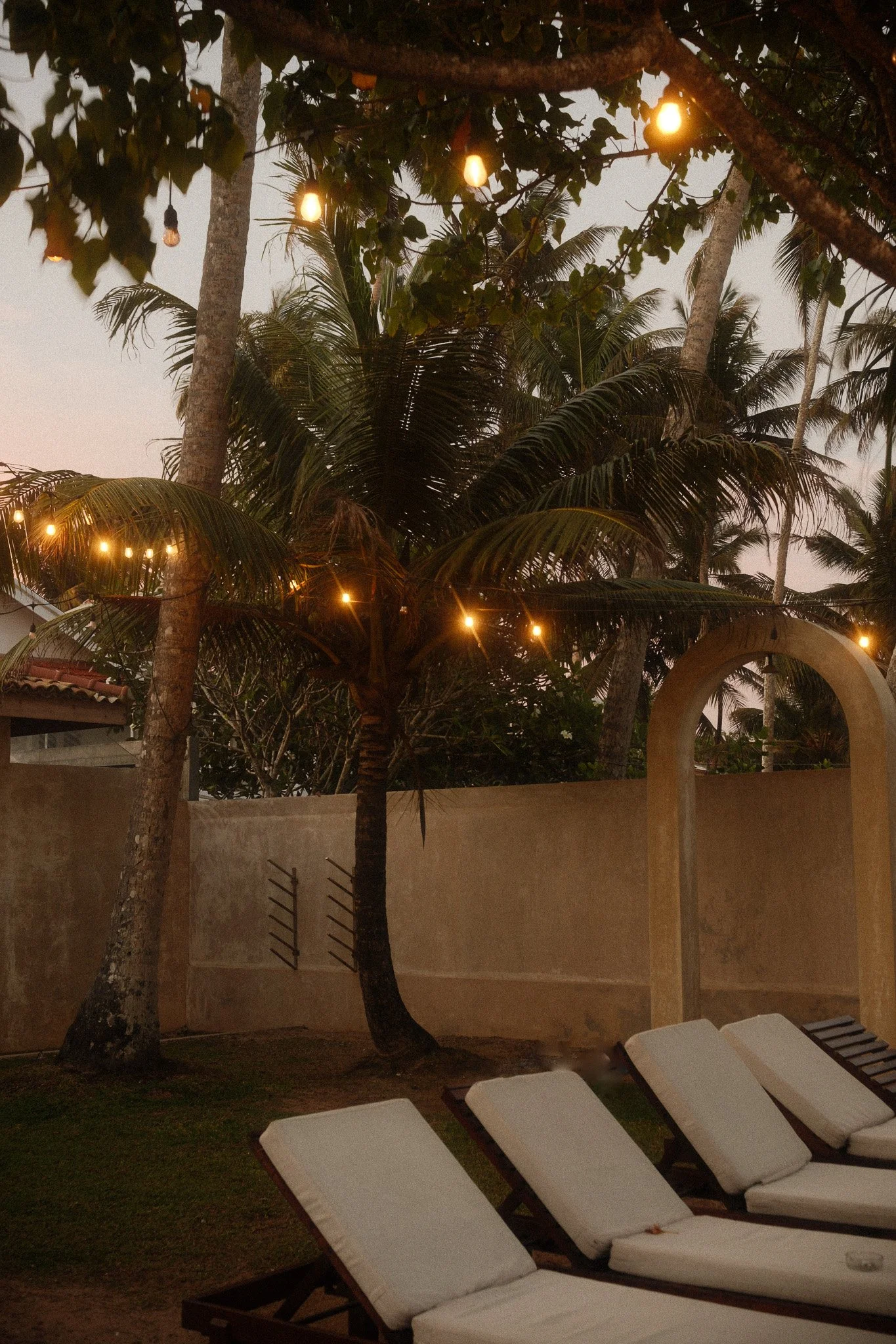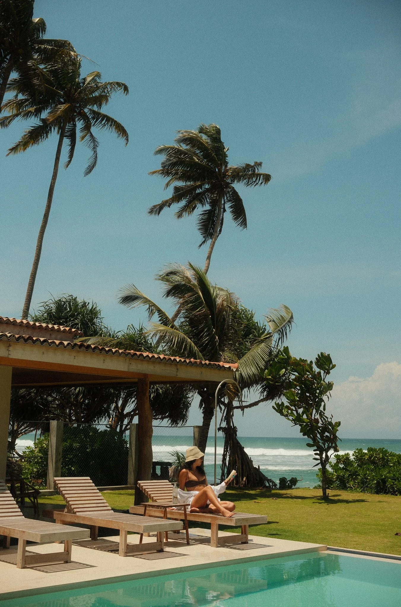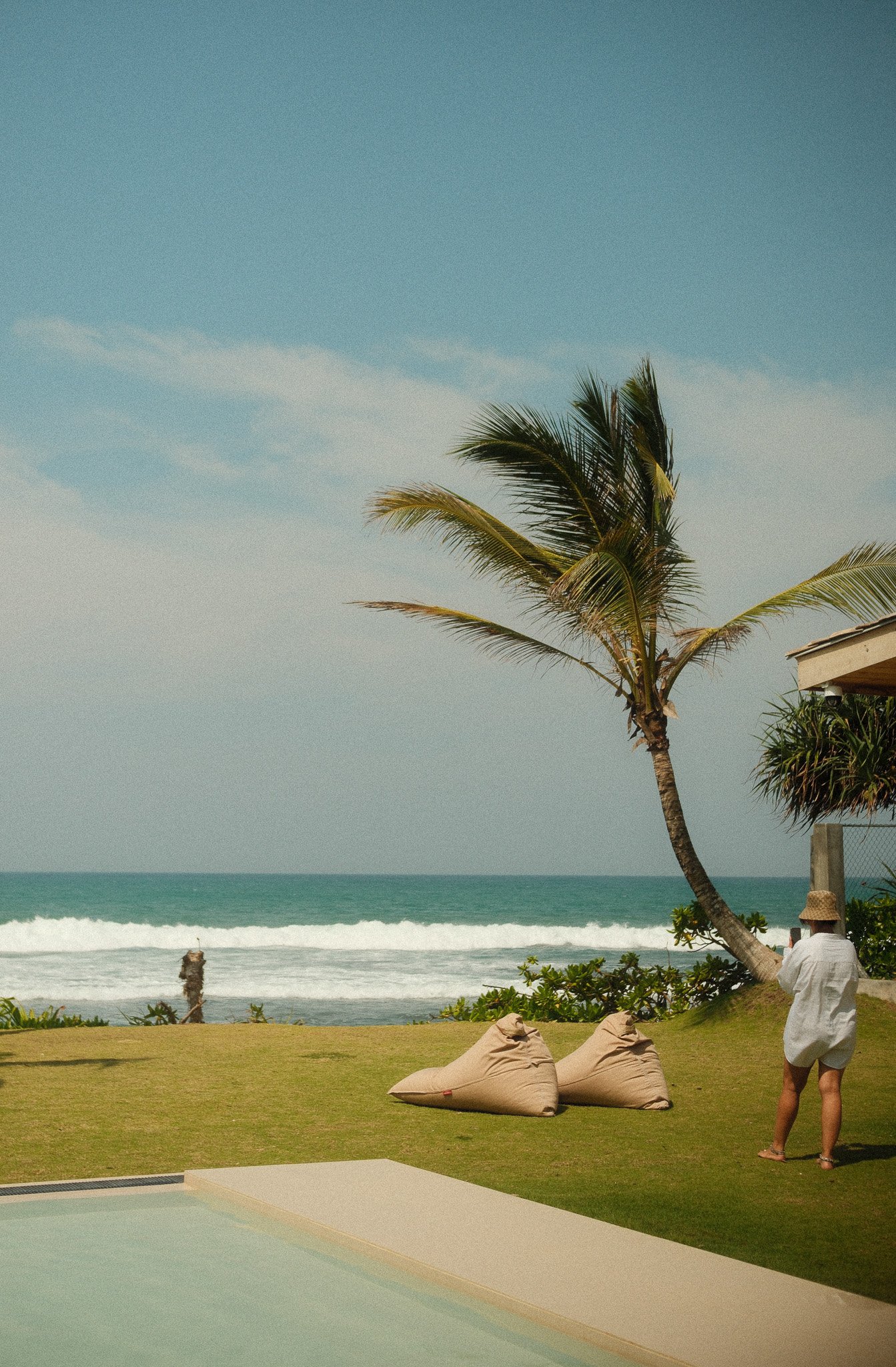 THE LOOK: Raw wood cabanas, hand-poured concrete, linen drapes, surfboards as sculpture, frangipani shadows.