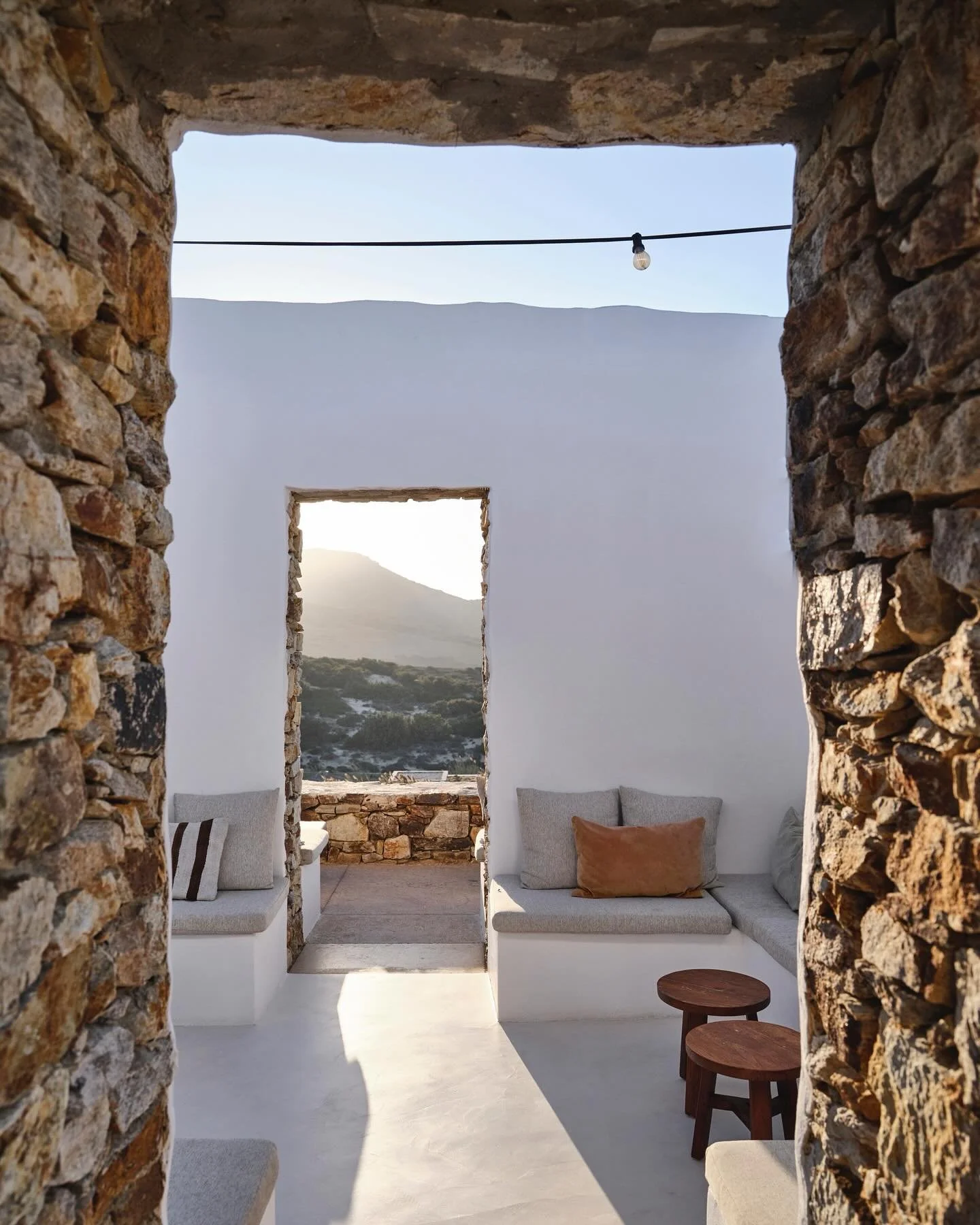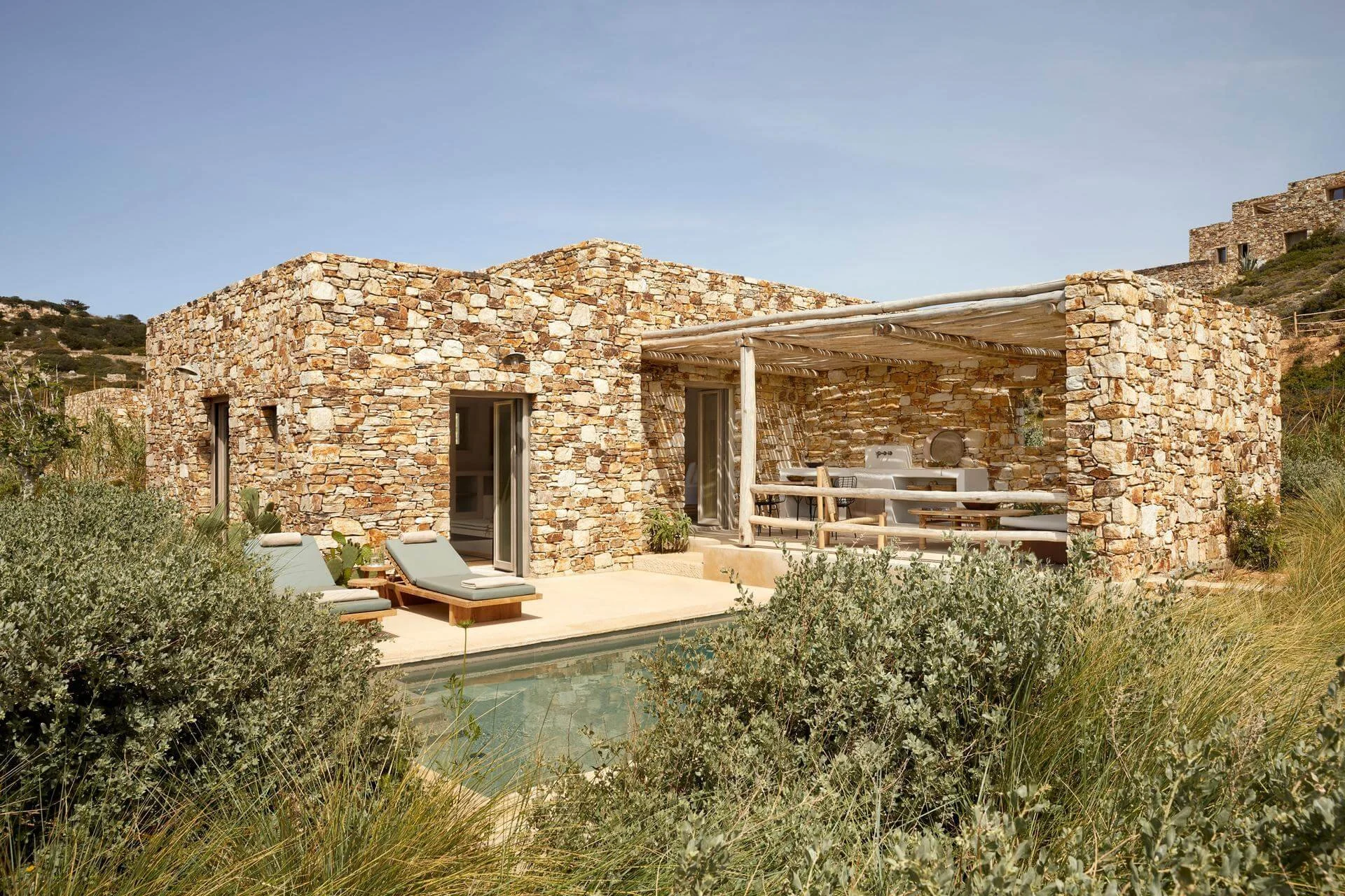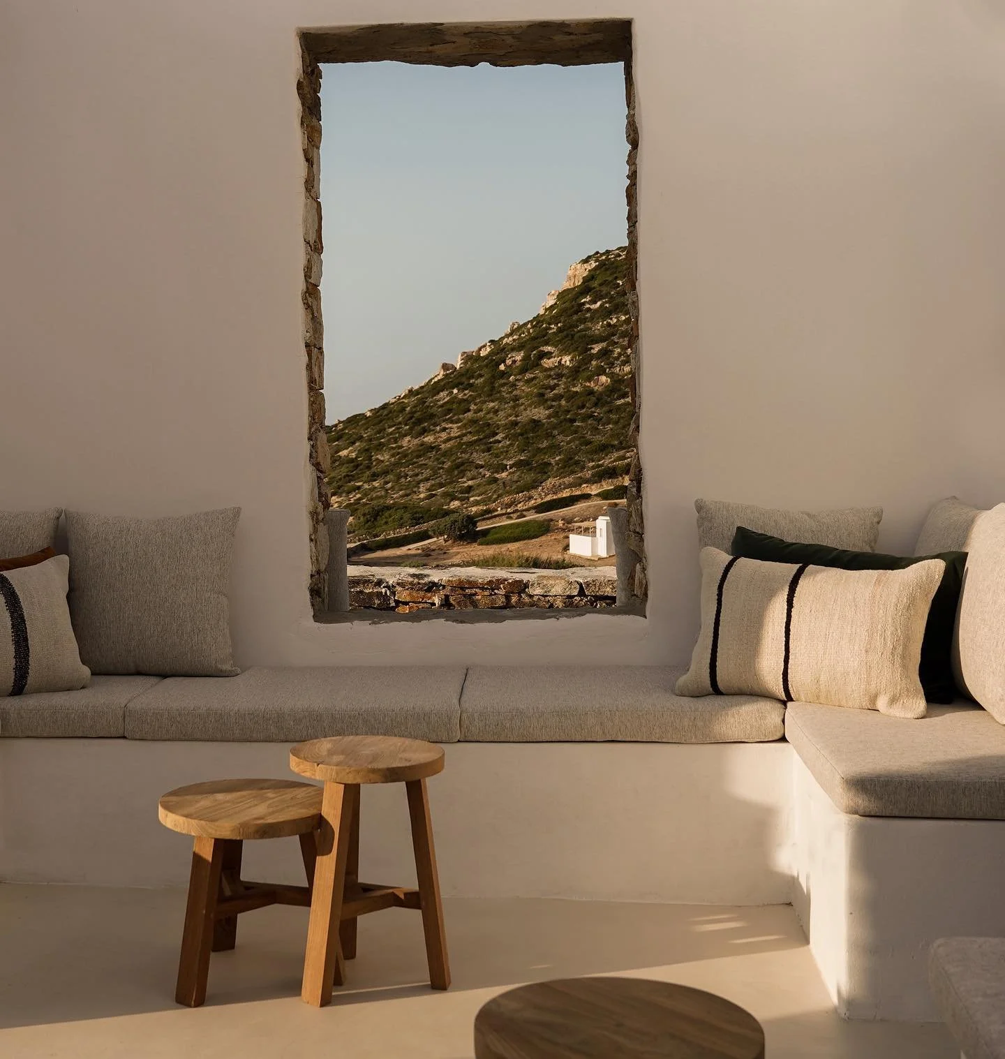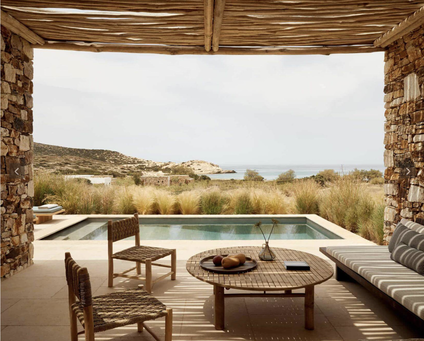 Expect natural materials, bespoke furnishings, raw textures, and enormous beds that face the Aegean horizon.