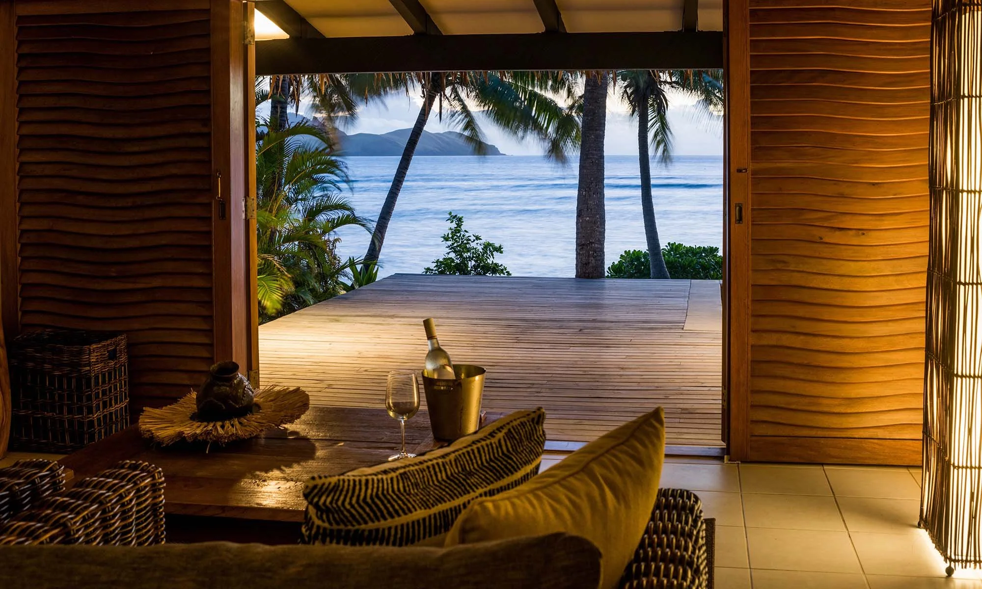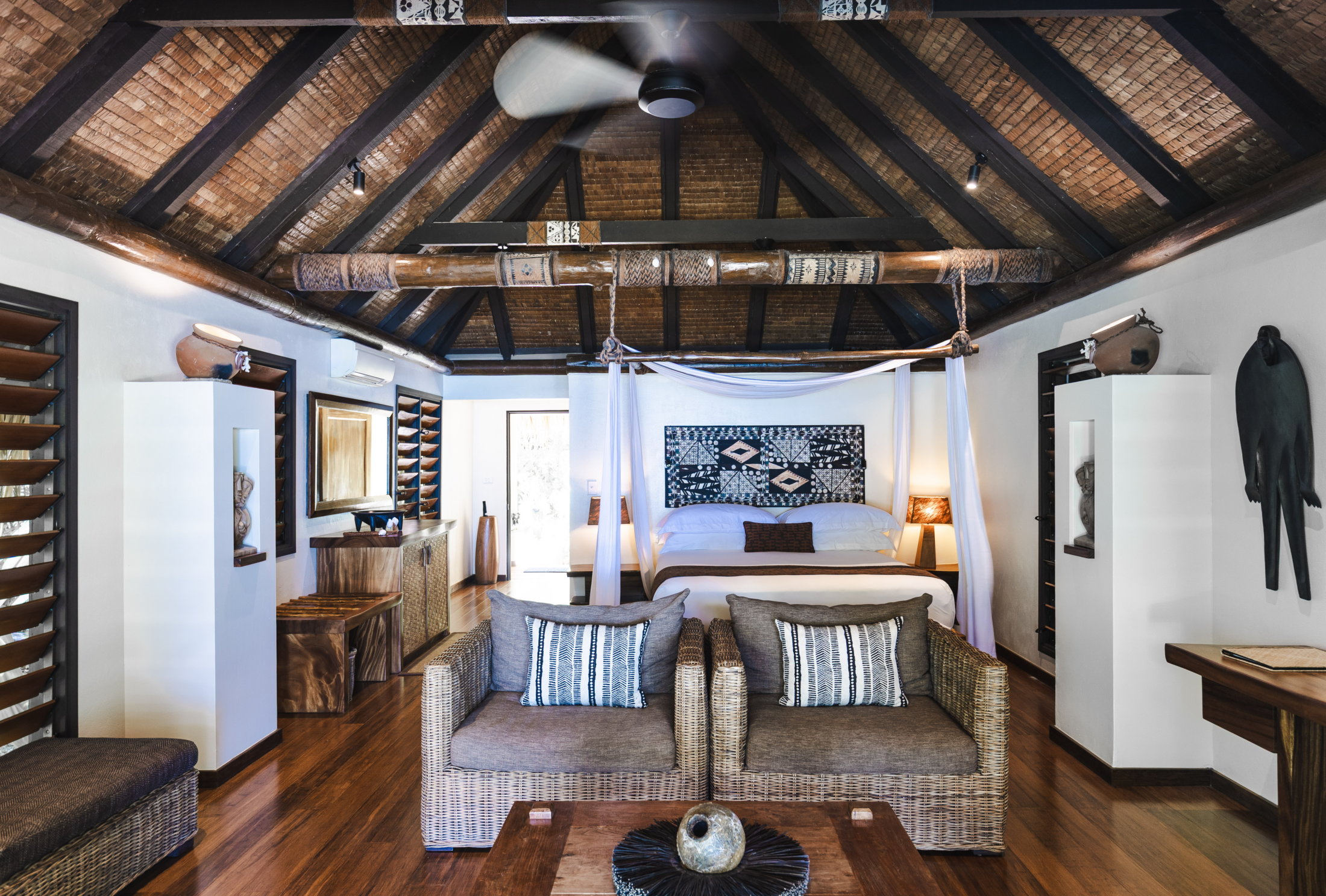 Each bure is a soft sculpture of Fijian design: high-vaulted ceilings that stretch like cathedral wings, hand-carved timber polished smooth by island air, open-air lounges where the breeze writes poetry across your skin. Muslin-draped beds float in the centre like cloud altars, kissed by coconut scent and soft shadow. There are shell mobiles that catch the light just so, and woven fans left on your pillow like offerings. The verandas open to the endless, where the only soundtrack is waves conversing with coral. Every detail is intentional, not ornamental. Designed for exhale, yes - but also for reverence, for remembering the beauty of breath itself.