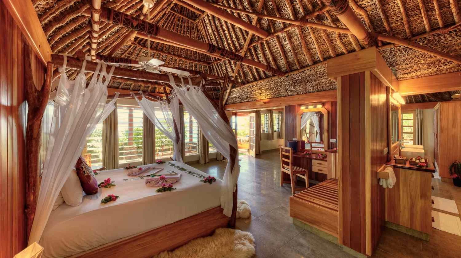 Each bure was handbuilt by Fijian craftsmen using native hardwoods and vernacular design. High thatched ceilings, woven mat walls, and canopy beds wrapped in linen speak to a grounded elegance rooted in place. Open-air showers, ocean-facing daybeds, and locally carved furnishings complete the invitation to slow down and feel held.